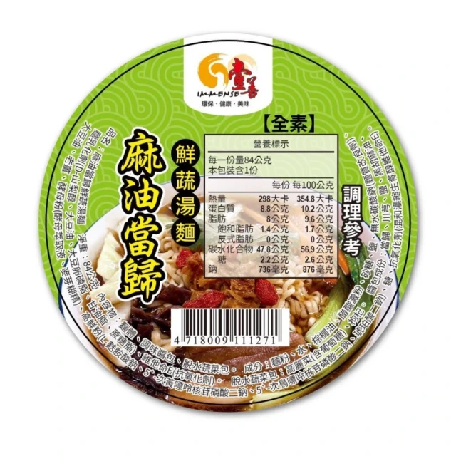 品 名: 杯麵-麻油當歸鮮蔬湯麵(沖泡)