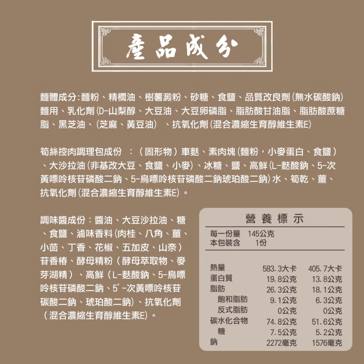 筍絲焢肉調理包成份 :(固形物)車麩、素肉塊(麵粉,小麥蛋白、食鹽)、大沙拉油(非基改大豆、食鹽、小麥)、冰糖、鹽、高鮮(L-麩酸鈉、5-次黃嘌呤核苷磷酸二鈉、5-鳥嘌呤核苷磷酸二鈉琥珀酸二鈉)水、筍乾、薑、抗氧化劑(混合濃縮生育醇維生素E)。