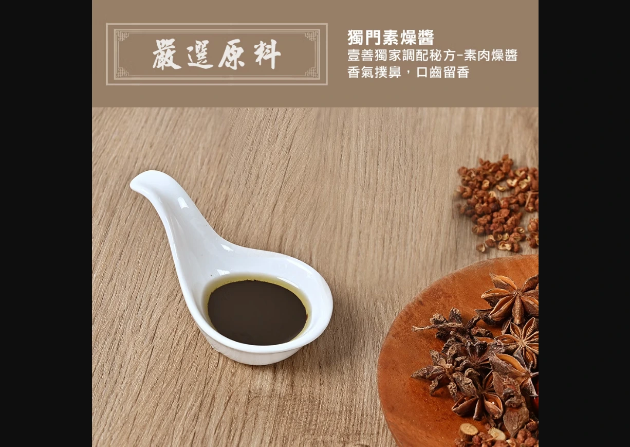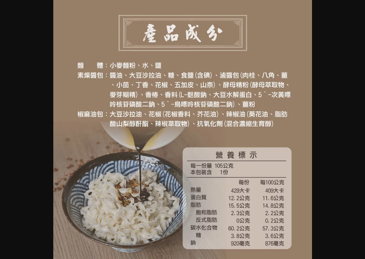 素燥醬包:醬油、大豆沙拉油、糖、食鹽(含碘) 、滷醬包(肉桂、八角、薑、小茴、丁香、花椒、五加皮、山奈)、酵母精粉(酵母萃取物、麥芽糊精)、香椿、香料(L-麩酸鈉、大豆水解蛋白、5‵-次黃嘌呤核苷磷酸二鈉、5‵-鳥嘌呤核苷磷酸二鈉)、薑粉