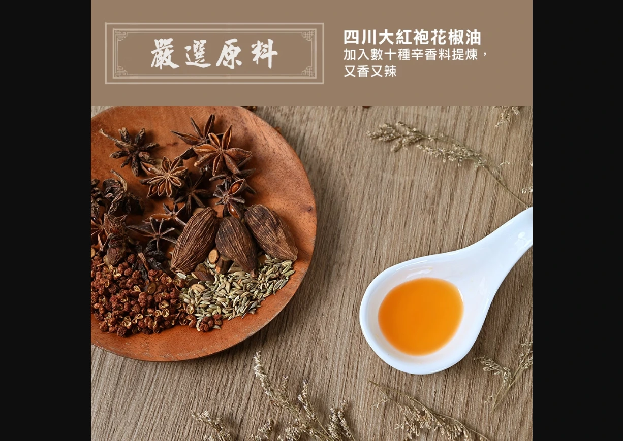 椒麻油包:大豆沙拉油、花椒(花椒香料、芥花油)、辣椒油(葵花油、脂肪酸山梨醇酐酯、辣椒萃取物)、抗氧化劑(混合濃縮生育醇)